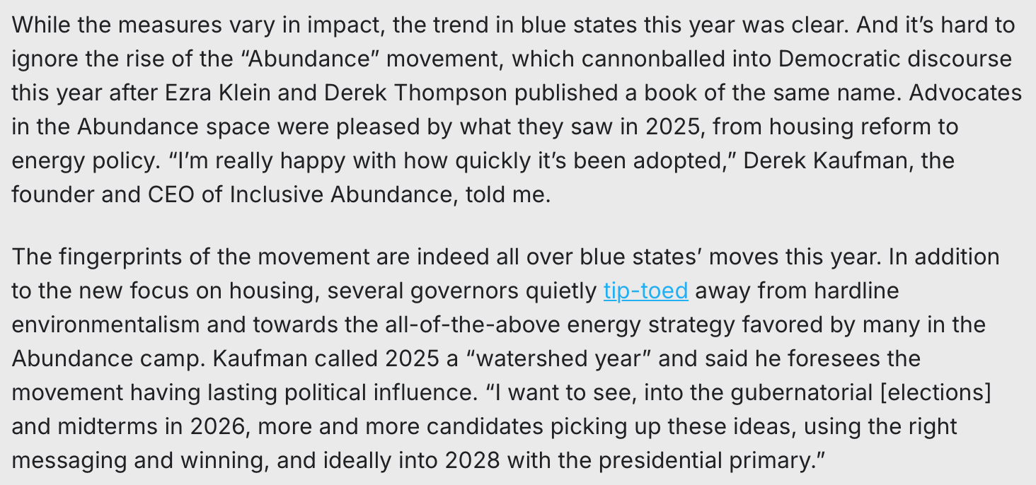 2025 marked the start of the “Abundance Era.” A year ago, abundance was a niche concept debated on X. Now, it’s a full-fledged movement, with candidates increasingly embracing abundance ideas.